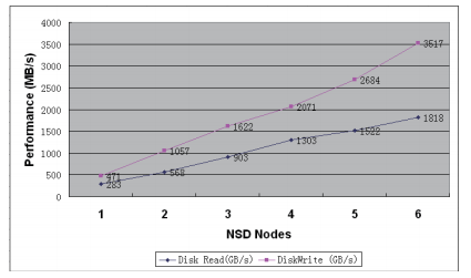 1.动态不中断业务的扩展性能和存储容量:NetApp E-7900采用模块化设计,其自身具有良好的系统扩展性,同时系统内部采用特制的高效XOR引擎(存储的CPU)芯片,实现RAID5、RAID6运算的硬件处理,因此,具有良好的系统输出性能。配合IBM通用的并行化大型文件系统GPFS,使系统具有优异的性能线型扩展。在现场测试中,我们的这一点给客户留下深刻的印象。下图是实 际测试的NAS头与系统输出性能的结果数据: